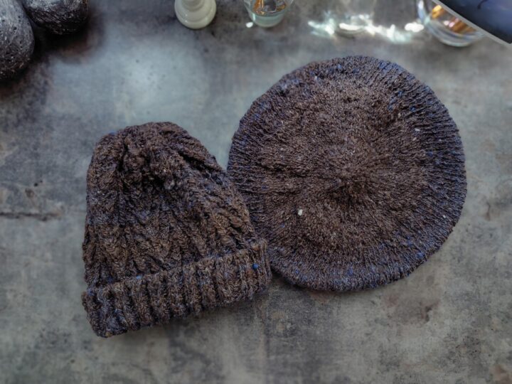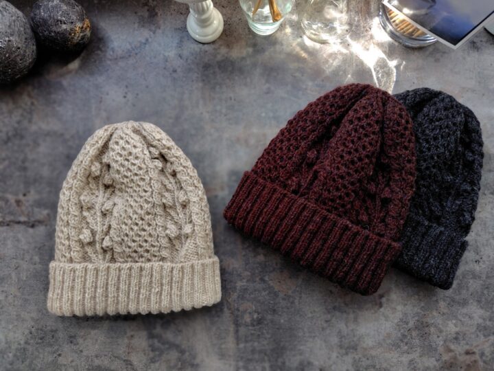 中でもアラン模様を取り入れたニット帽は、活動当初から様々な組み合わせを楽しみながら編み続けている作品です。