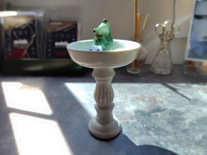 静岡の作陶家 sakuya masuda さんの作品です。その上にいるカエルは、中華街で見つけました。