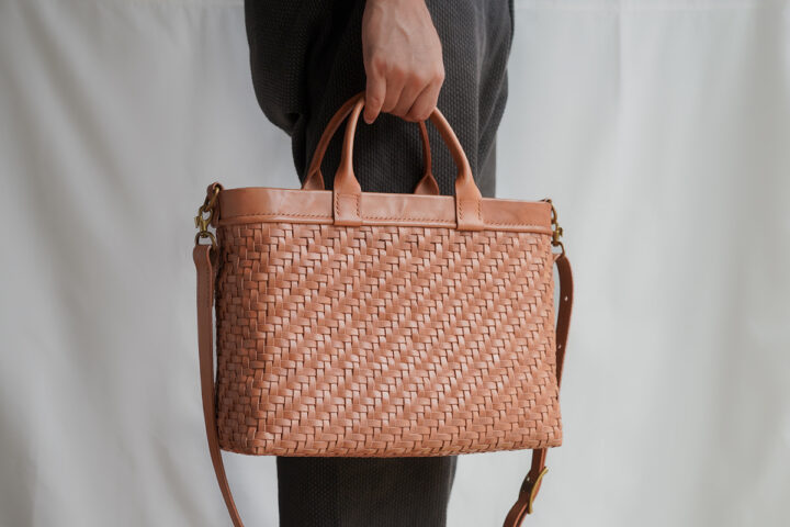 東北の代表的な手仕事のひとつでもある編み籠から着想を得て生まれた鞄で、樹皮を用いた籠編みの技術と革鞄作りで培った技術を組み合わせて作られています。