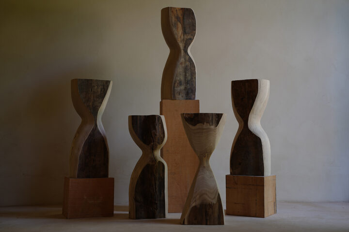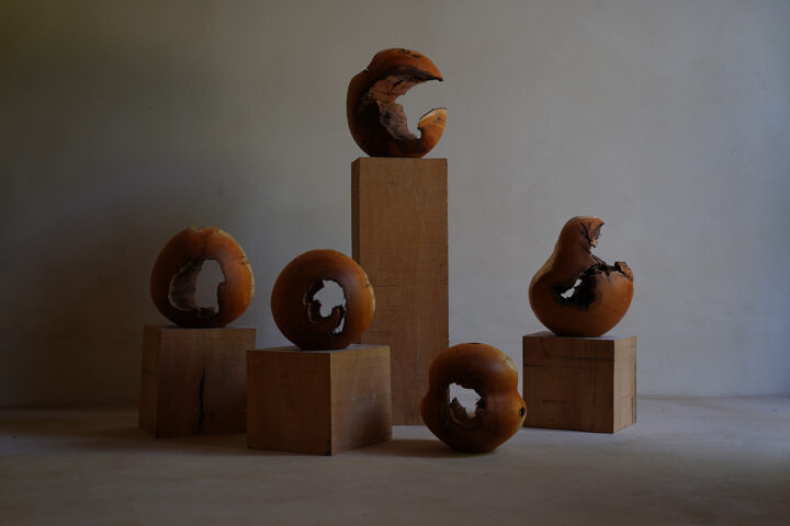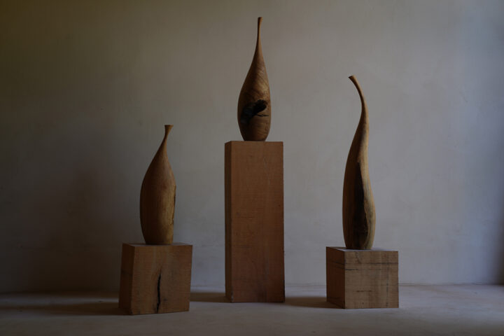 最近は大きな作品に力を注いでおり、オブジェ、スツールは手で削り出し、美しい形を目指しています。