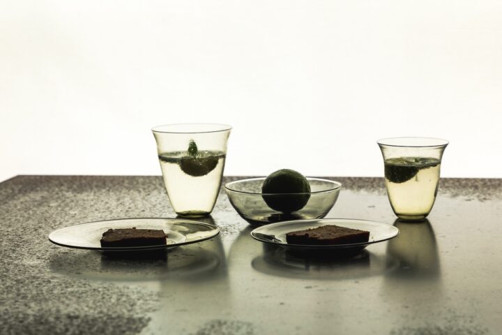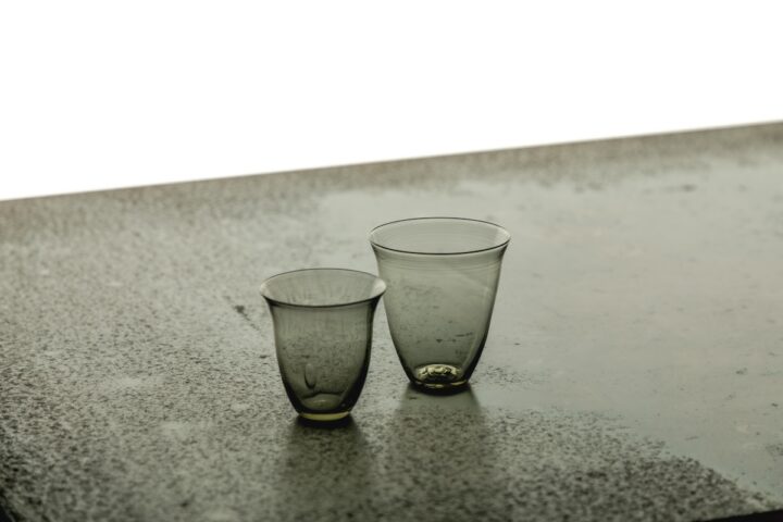 北陸、富山県で制作されるスモーキーな色合いに研ぎ澄まされたフォルムのガラス。