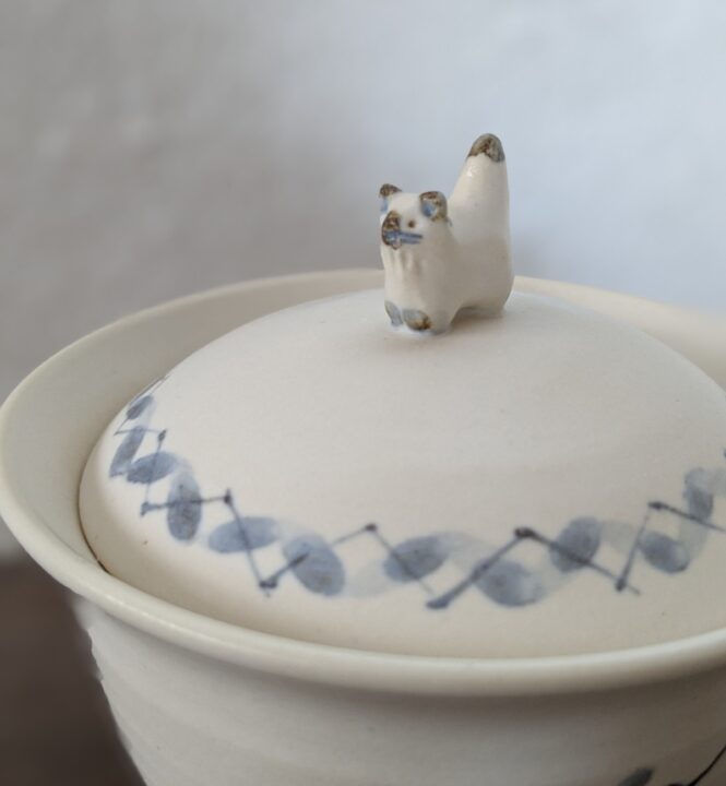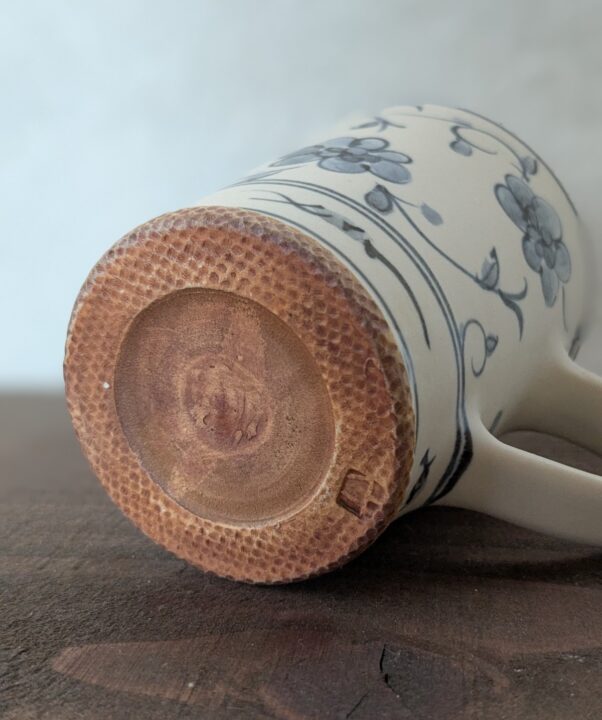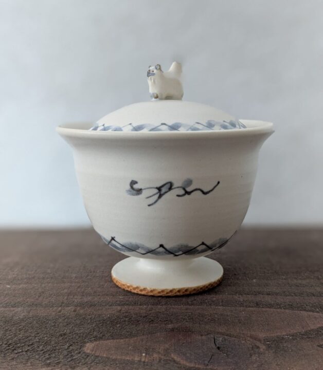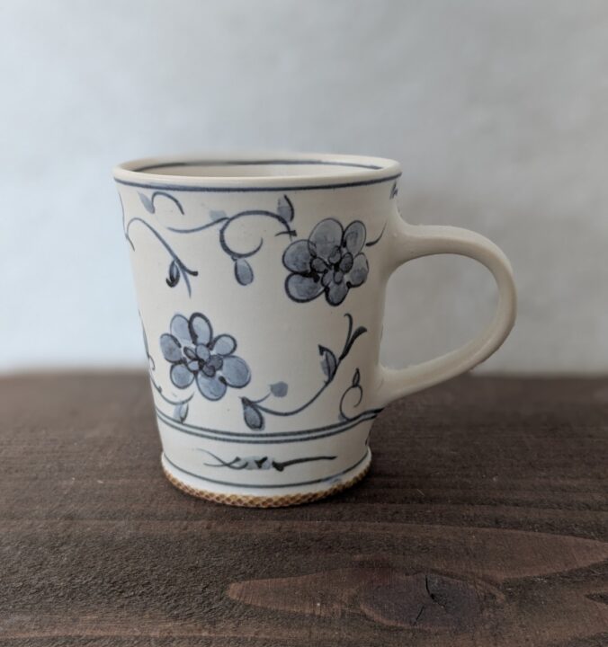 比較的シンプルな形に染付で絵を描いて、マットな釉薬で仕上げています。